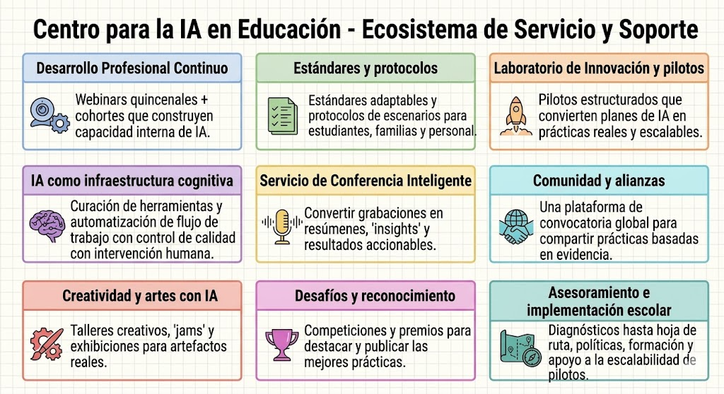 Una iniciativa global que apoya a las escuelas en la integración de la inteligencia artificial mediante formación profesional, estándares, recursos y comunidad, con el fin de que la IA amplíe el pensamiento, proteja a los estudiantes y fortalezca las relaciones humanas.