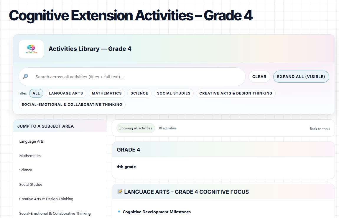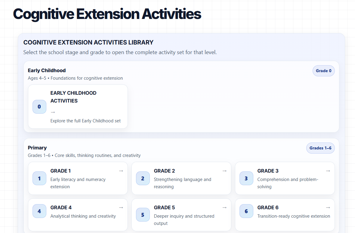 Cognitive Extension is not presented as an abstract theory. It is organized as a practical activity library that educators can explore by school stage and grade level.