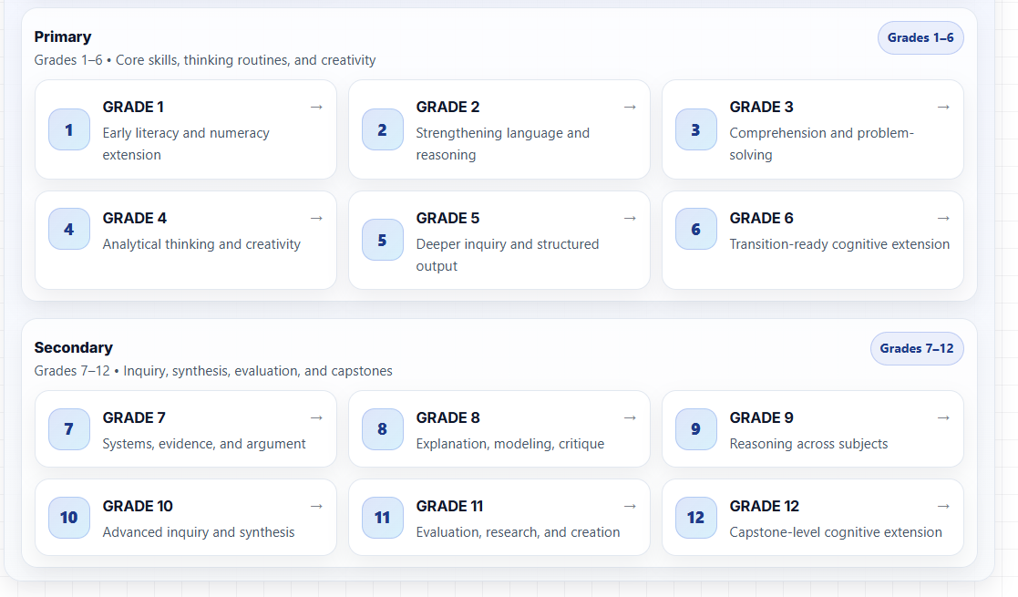 By Grade 12, the section reaches capstone-level cognitive extension. This gives the entire library coherence. It is not simply a collection of activities. It is a progression of increasingly sophisticated ways of thinking with AI.