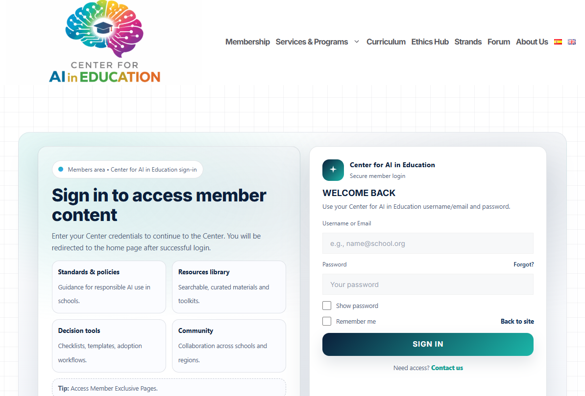 When visitors click into grade-level pages, they are redirected to the Center’s secure sign-in area. That sign-in page reinforces the wider value of membership by pointing to the broader ecosystem of resources available inside the Center, including standards and policies, searchable resources, decision tools, and community collaboration.