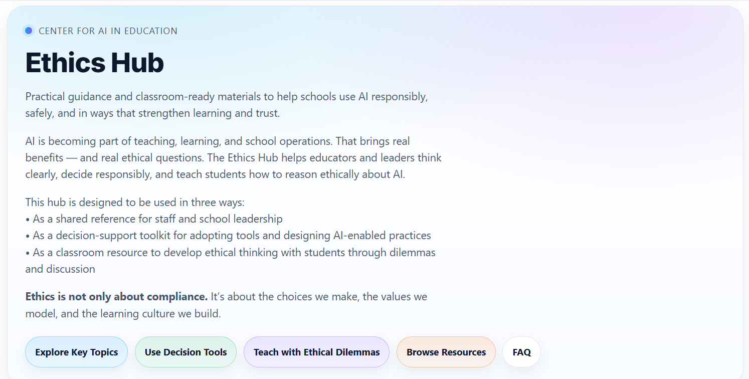 A practical tour of the Ethics Hub of the Center for AI in Education — designed to help schools think clearly, decide responsibly, and bring ethical reasoning into the classroom.