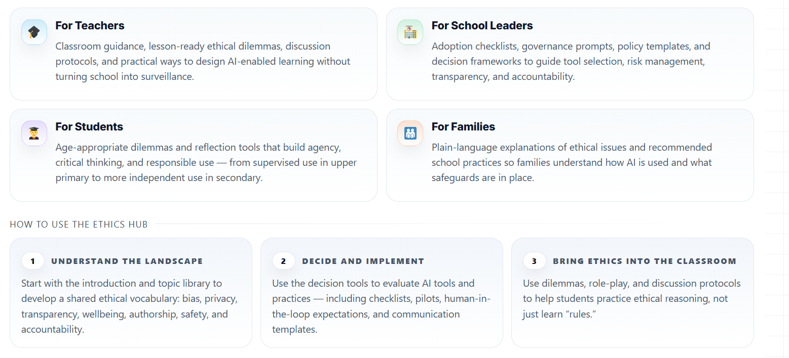 The Ethics Hub is structured for teachers, school leaders, students, and families. Each audience finds materials that speak directly to its role in responsible AI use.