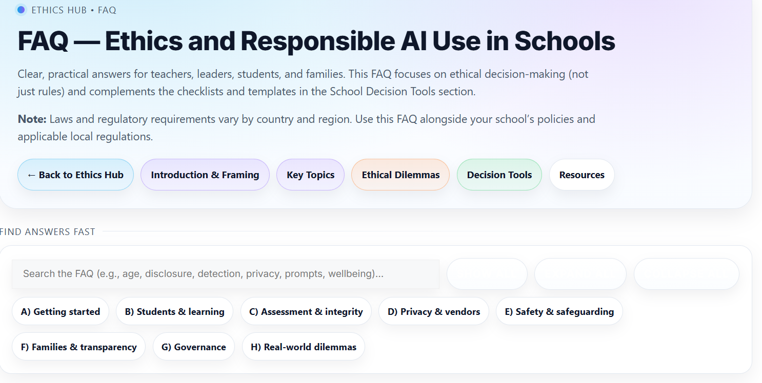 The FAQ brings ethical thinking down to the practical questions schools face every day, from student use and assessment integrity to privacy, safeguarding, governance, and family transparency.
