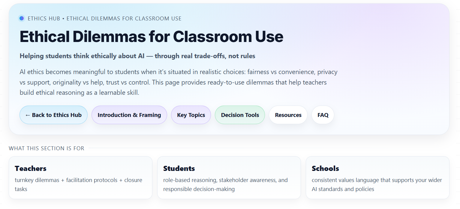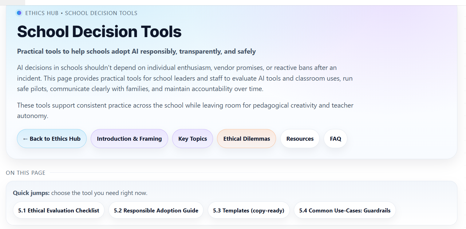 This part of the hub is especially useful for school leaders and implementation teams because it turns ethical reflection into concrete decision-making and accountable practice.